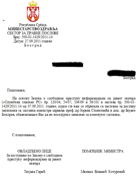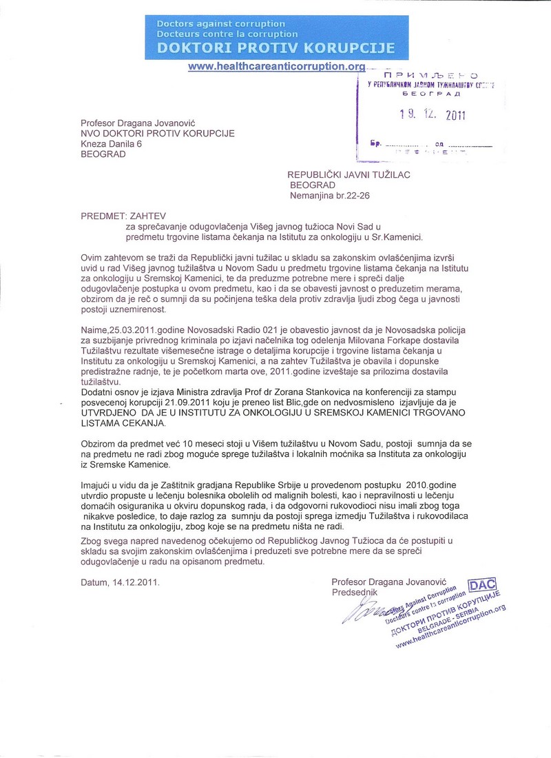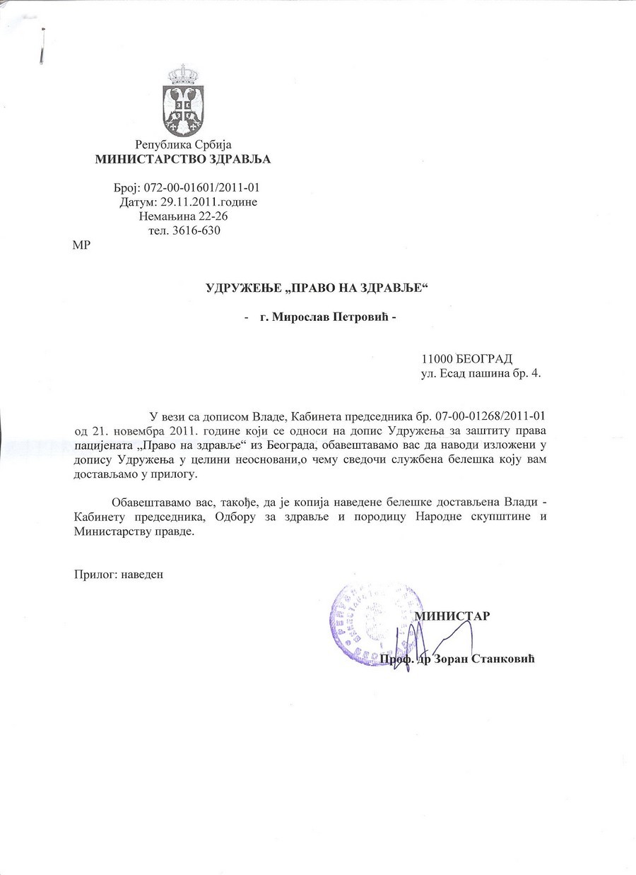 ![]() ----------------------- Poštanske povratnice dopisa upućenih od dr Bojane Bokorov pokrajinskom sekretaru za zdravstvu Atili Čengeriju sa ukazivanjem na kršenje zakona i teško krivično delo protiv života i zdravlja ljudi na Institutu za onkologiju Vojvodine ![]() ----------------- Dopis novom ministru zdravlja dr Zoranu Stankoviću o kršenju zakona na Institutu za onkologiju Vojvodine i neophodnosti da hitno reaguje kako bi sprečio nastavljanje ukidanje prava na lečenje obolelih od malignih bolesti, 29.mart, 2011.